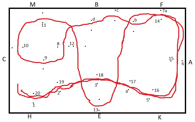 På fredagmorgonen började stalltjänsten redan 06:30 för att vi skulle få så mycket tid som möjligt innan examen. Vi som hade stalltjänst, jag och en tjej som heter Fanny, var i andra gruppen tillsammans med Linda. Åse, Miriam, Martina och Cecilia var i första gruppen. Vi i andra gruppen fick börja bygga banan vid 8 medans de andra gjorde sig iordning. Jag gjorde ett tafatt försök till banskiss med hjälp av MS Paint så det är inte så lättläst men det är alltid något. Bredden mellan konerna i varje port var 160cm. Då vagnen är 140cm bred innebär det att vi hade 10cm till godo på vardera sida... det var väldigt trångt!